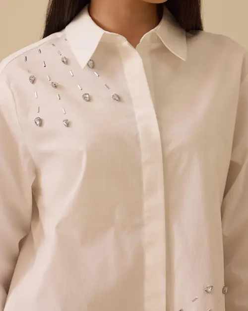 Asimetrik Taş Detaylı Gömlek, modern ve şık tasarımıyla stilinize zarif bir dokunuş katar.