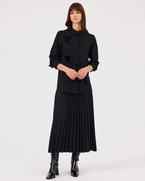 Desenli Düğmeli Gömlek, modern desenleriyle öne çıkar, gizli düğme tasarımı sayesinde yalın ve şık bir görünüm sunar.