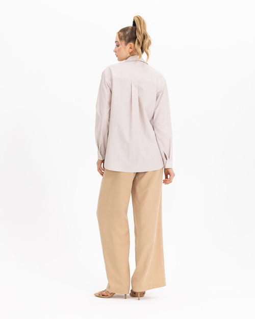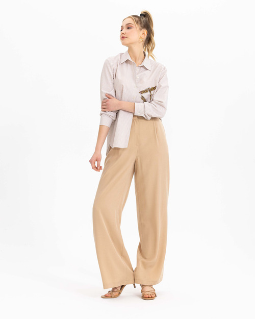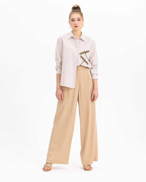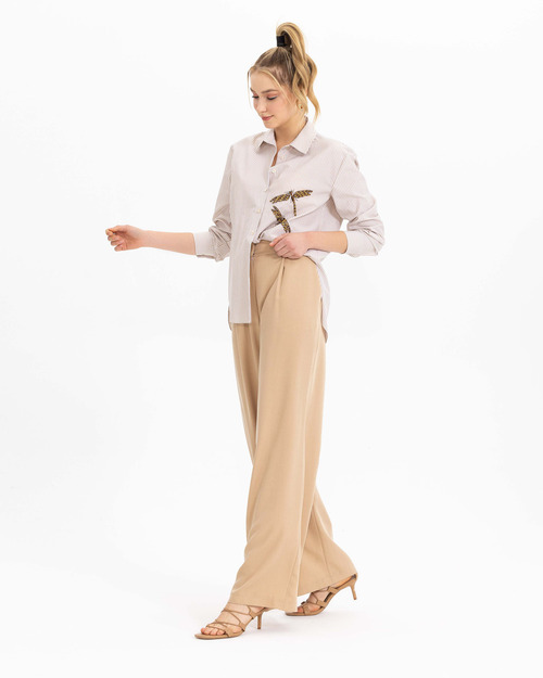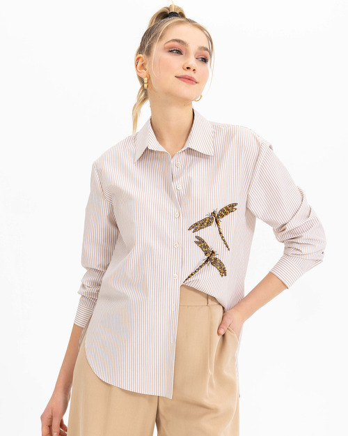Boncuk işlemesi ile karakter kazanan gömlek, çizgi deseni ile dinamik bir stil yansıtıyor. Gömleği, açık tonlarda palazzo pantolonlar ile kombinleyebilir, ofis stilinizi güçlendirebilirsiniz.