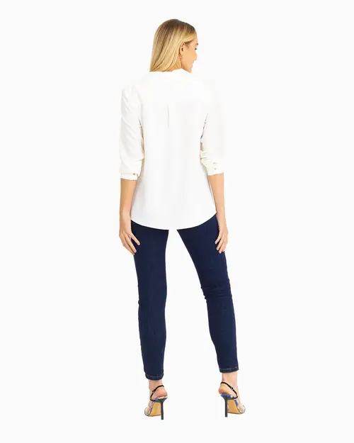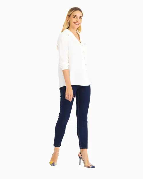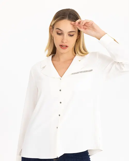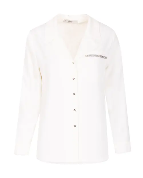 Ceket yakası ile formal stile göz kırpan gömlek, taş detayı ile şıklık katıyor. Gömleği, Seçil pantolonlar üzerinde kombinleyerek, öne çıkarabilirsiniz.