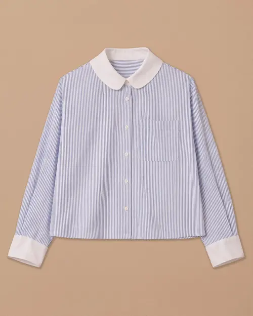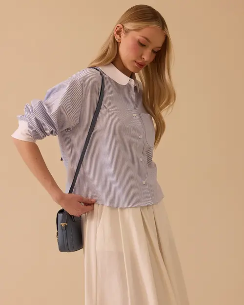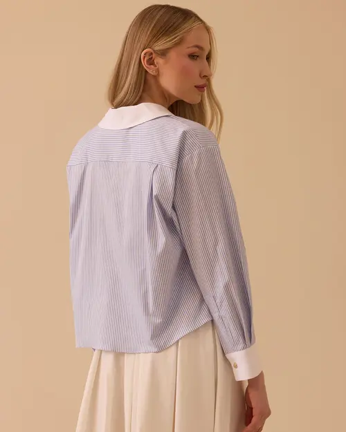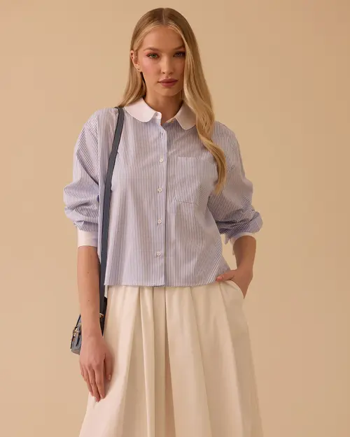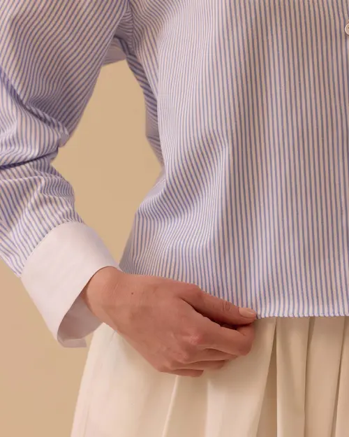 Çizgili Bel Boy Gömlek, zamansız çizgi deseni ve bel boy kesimiyle modern bir stil sunar.