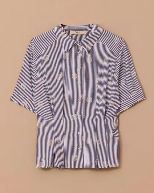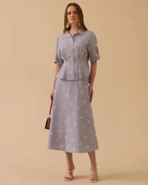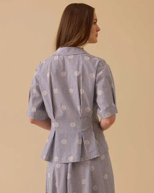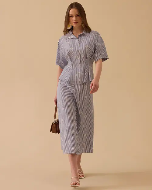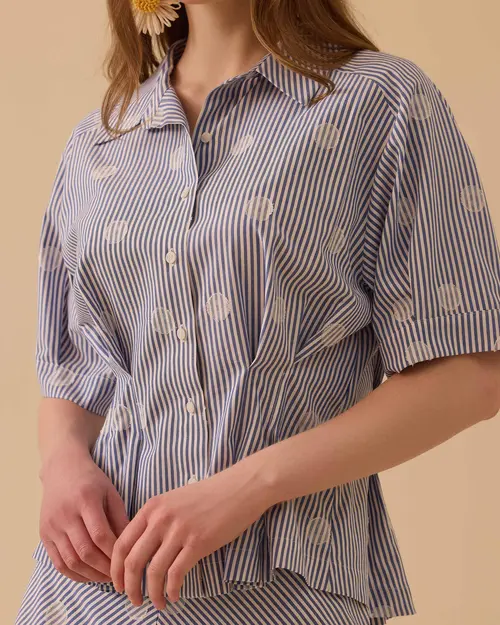 Çizgili Pileli Desenli Gömlek, hareketli çizgileri ve zarif pile detaylarıyla şık bir görünüm sunar.