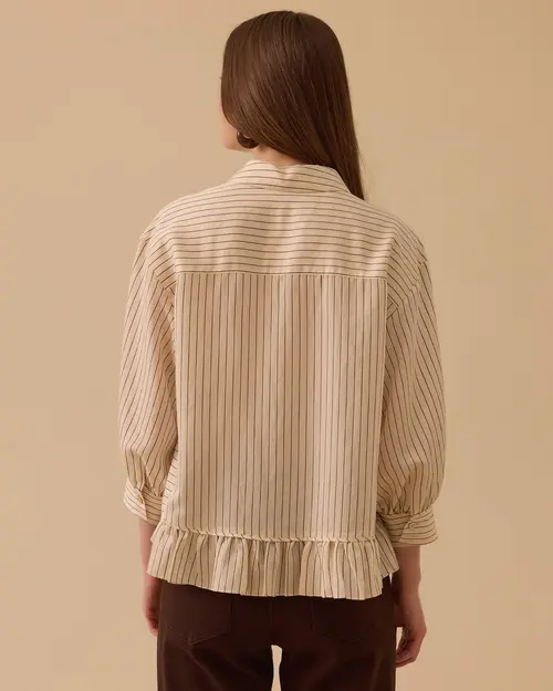 Pul detaylı fırfırlı çizgili gömlek, hareketli yüzeyi ve hafif dokusuyla günlük kombinlere farklı bir enerji katar, rahat kullanım sunar.