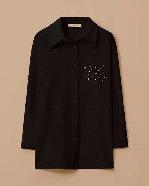 Taş Detaylı Kadife Gömlek, yumuşak dokusu ve ışıltılı taş detaylarıyla şık bir görünüm sunar, özel gün ve günlük stilinize zarif bir dokunuş katar.