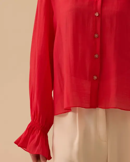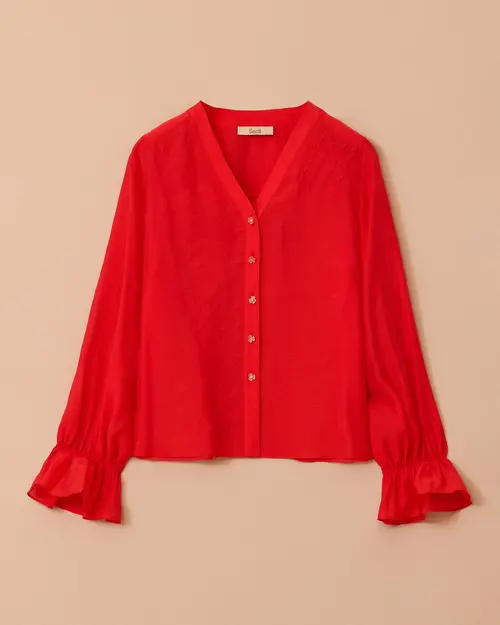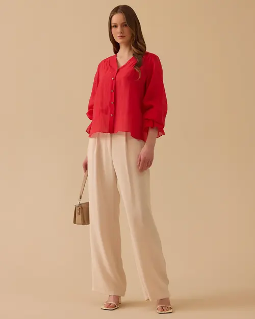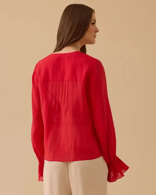 V Yaka Büzgü Kollu Gömlek, zarif yaka kesimi ve büzgü detaylı kollarıyla şık ve rahat kullanım sunar.
