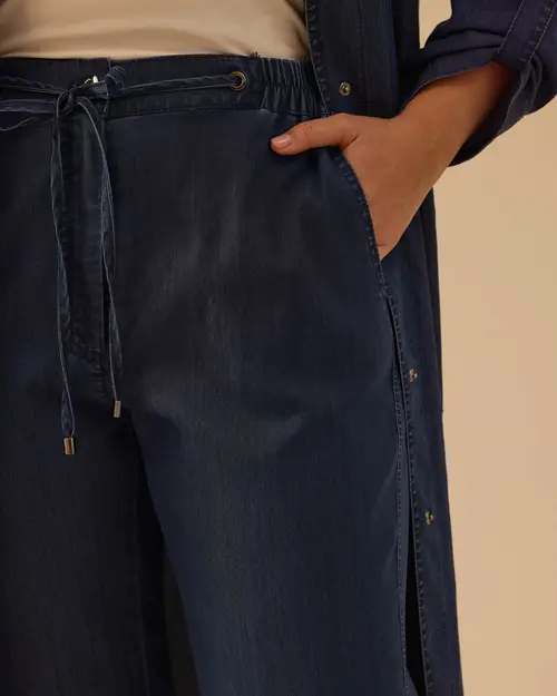Büyük Beden Bel Bağcıklı Bilek Boy Jean Pantolon, rahat kesimi ve bağcıklı beliyle gün boyu konfor sunar.