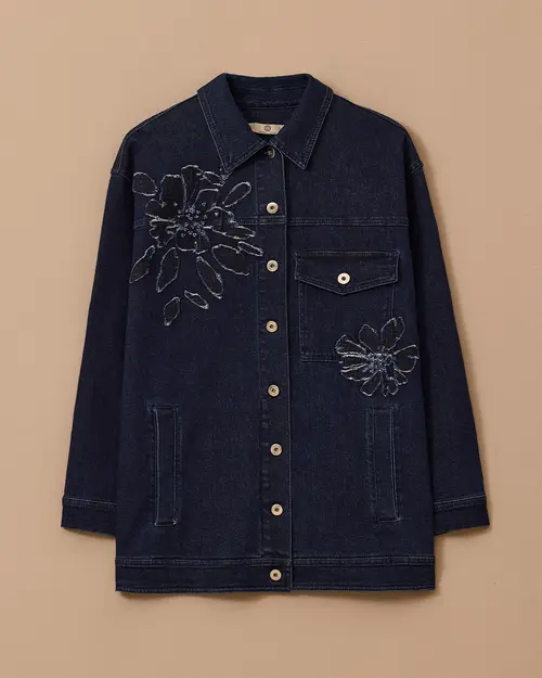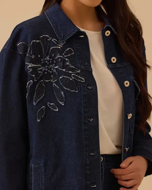 Çiçek Nakışlı Jean Ceket, çiçek işlemeleriyle feminen bir hava katan, dayanıklı denim kumaşıyla günlük kullanıma uygun şık bir cekettir.