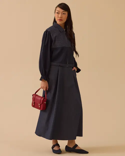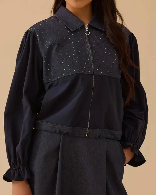 İki kumaşlı bel boy jean ceket, günlük kombinlere dinamik bir hava katar.