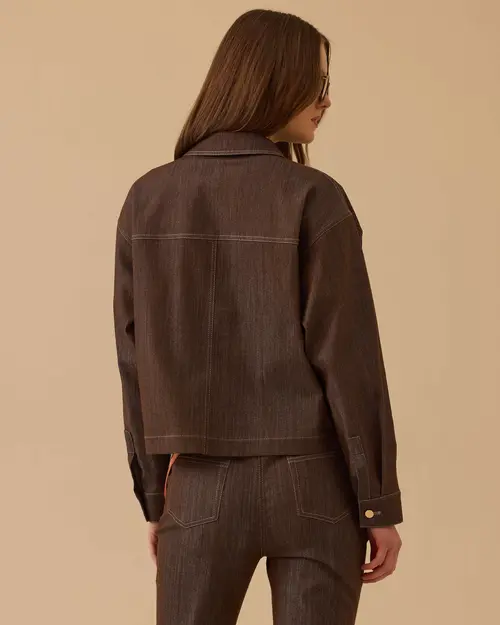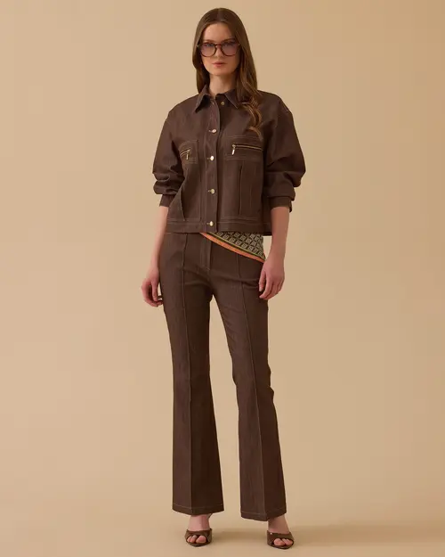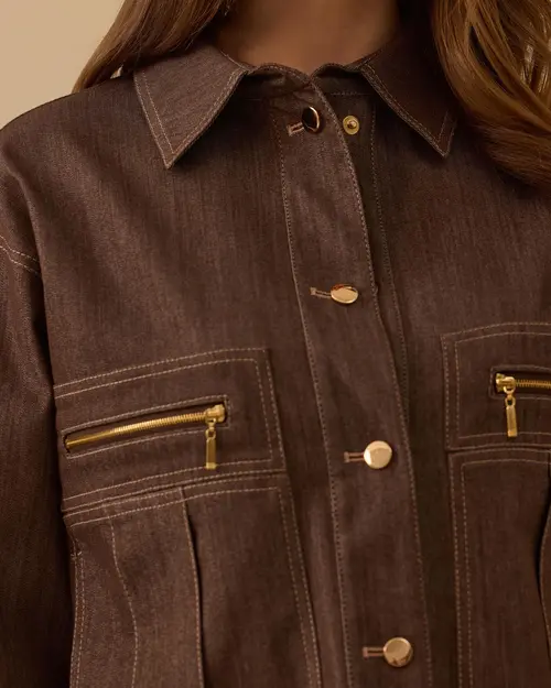Fermuar Detaylı Bel Boy Jean Ceket, bel boy kesimi, fermuar ve düğme detaylarıyla modern, dinamik ve şık bir stil sunar.