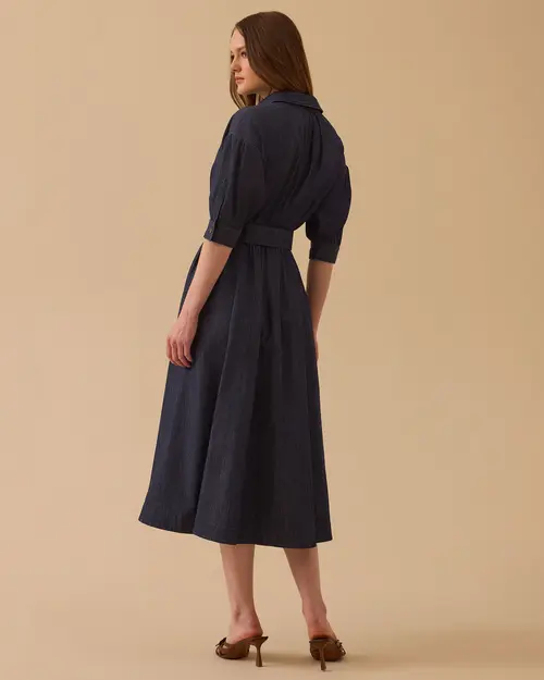 Midi boy beli lastikli denim elbise, rahat kalıbıyla gün boyu konfor sunar, bel vurgusuyla dengeli görünüm sağlar