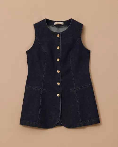Yuvarlak Yaka Düğmeli Jean Yelek, klasik denim dokusu ve düğme detayıyla modern, rahat ve kombin tamamlayan bir stil sunar.