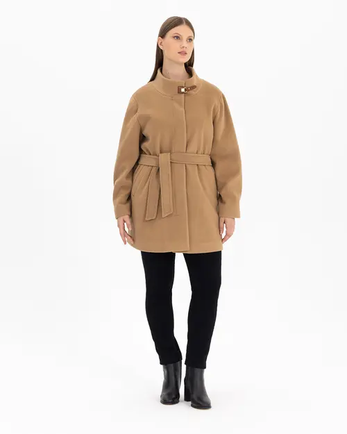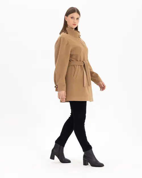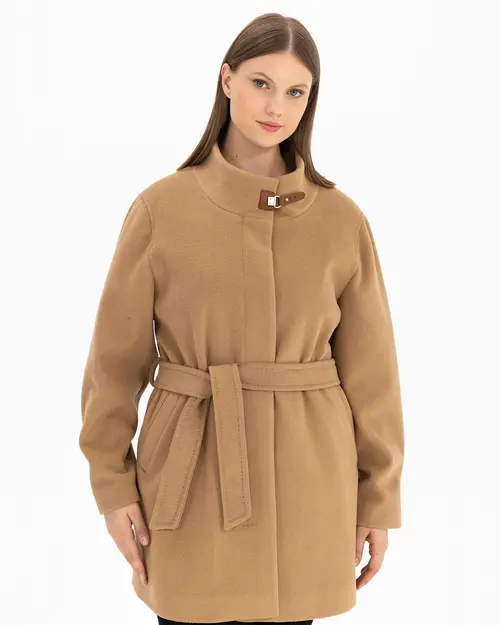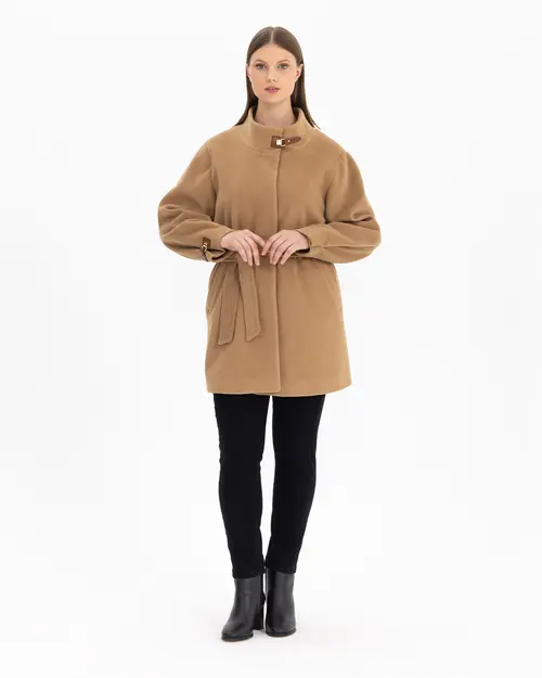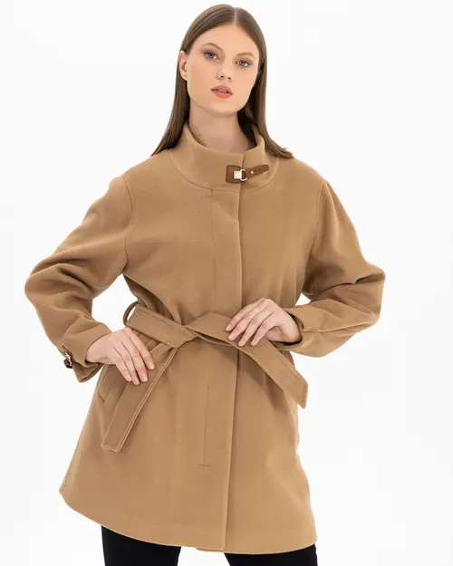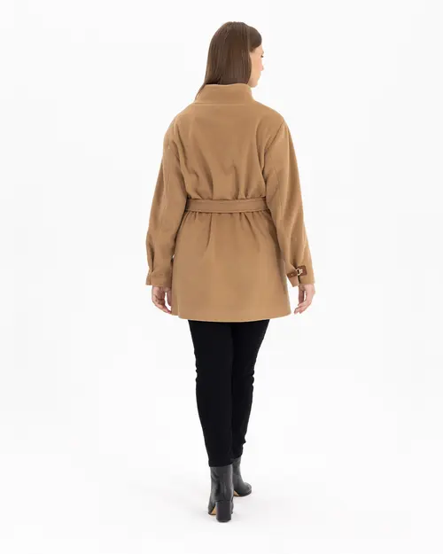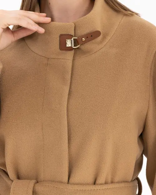 Suni deri detayına sahip kaban, hakim yakasıyla farklılaşıyor. Stil sahibi bir görünümü yansıtan kabanı, soğuk kış günlerinde gardrobunuzun temel parçası olarak kullanabilirsiniz.