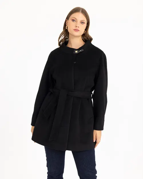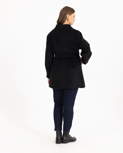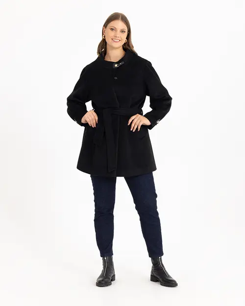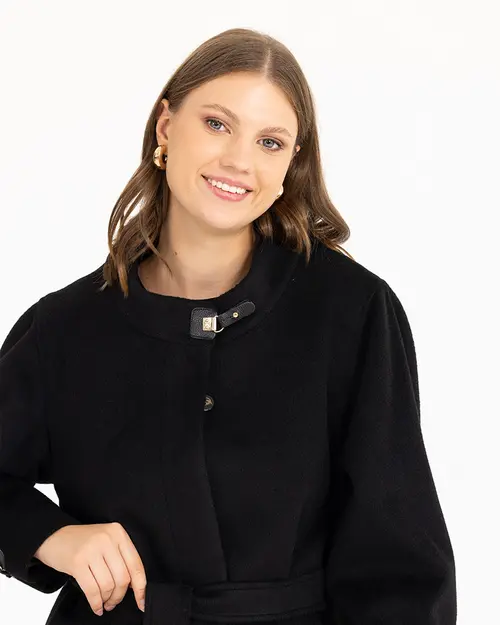 Suni deri detayına sahip kaban, hakim yakasıyla farklılaşıyor. Stil sahibi bir görünümü yansıtan kabanı, soğuk kış günlerinde gardrobunuzun temel parçası olarak kullanabilirsiniz.