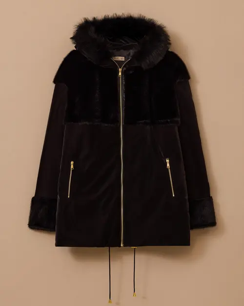 Suni Kürk Kapüşonlu Fermuarlı Kaban, sıcak tutan kürk detayları ve rahat kesimiyle günlük şık kullanım sunar.
