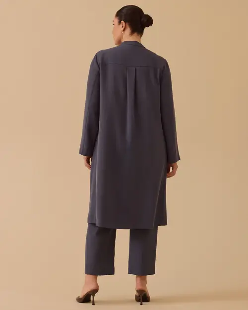 Büyük Beden Hakim Yaka Uzun Kap, zarif hakim yaka detayı ve uzun kesimiyle şık bir siluet sunar.