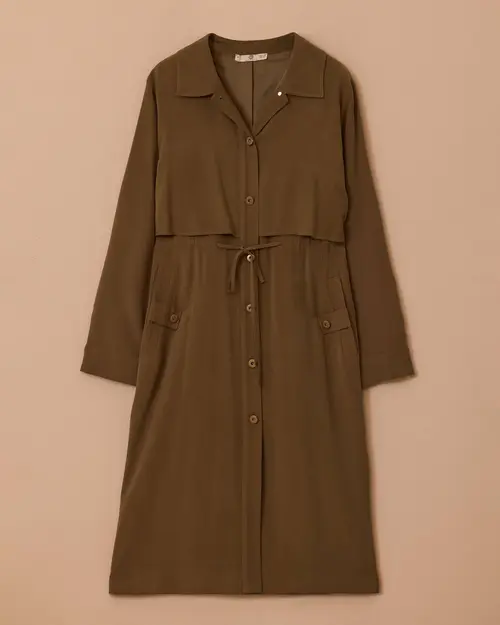 Katmanlı Bel Bağcıklı Düğmeli Kap, katmanlı tasarımı, ayarlanabilir bel bağcığı ve düğme detaylarıyla hem şık hem kullanışlı bir dış giyim parçası sunar.