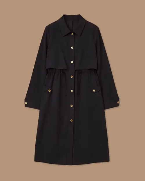 Katmanlı Bel Bağcıklı Düğmeli Kap, katmanlı tasarımı, ayarlanabilir bel bağcığı ve düğme detaylarıyla hem şık hem kullanışlı bir dış giyim parçası sunar.