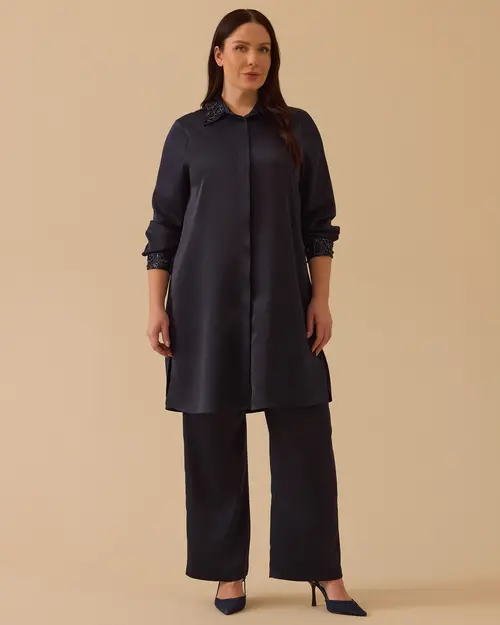 Büyük Beden Bol Paça Saten Pantolon, akıcı dokusu ve rahat kesimiyle gün boyu konfor sağlar.