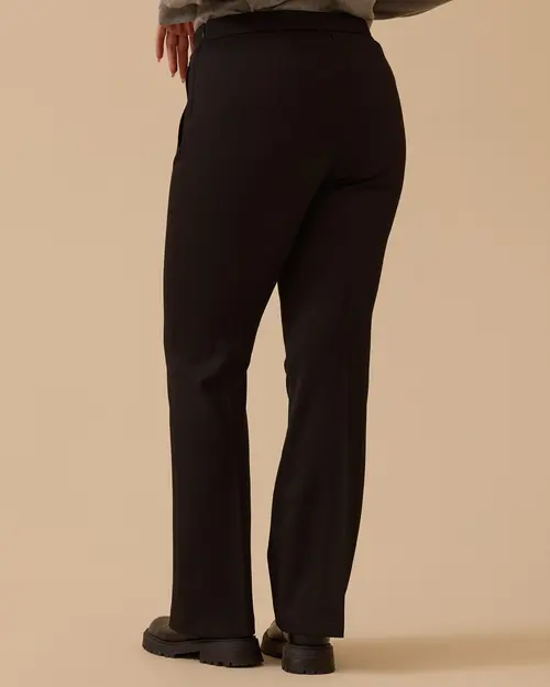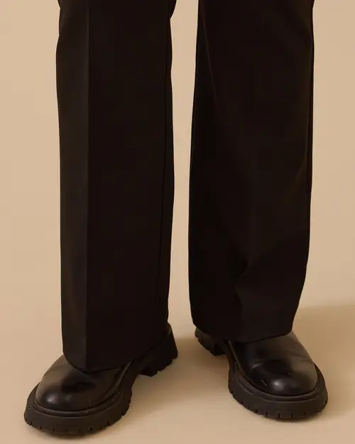 Büyük Beden İspanyol Paça Pantolon, yüksek bel ve geniş paça kesimiyle vücut oranlarını dengeleyerek zarif bir siluet sunar.