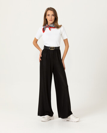 Geniş kalıbı ile konfor sağlayan pantolon, parlak dokusu ile dikkat çekiyor. Pantolonu kemer ile tamamlayarak güçlü bir stil elde edebilirsiniz.