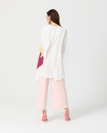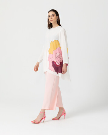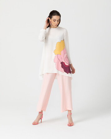 Pudra rengi bir pantolona hiç bu kadar yakışmamıştı. Geniş paça pantolonu, SCL’nin büyük desen çiçekli tuniği ile kombinleyebilir, bulunacağınız ortama bahar etkisi getirebilirsiniz.