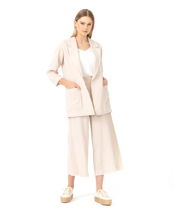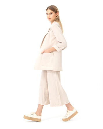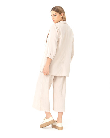 Naturel rengi ile dikkat çeken pantolon, mevsim kombinleriniz için güçlü bir tamamlayıcı oluyor. Pantolonu aynı kumaştan üretilmiş ceketi ile kombinleyerek, rahat ve şık bir stil yansıtabilirsiniz.
