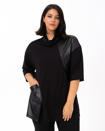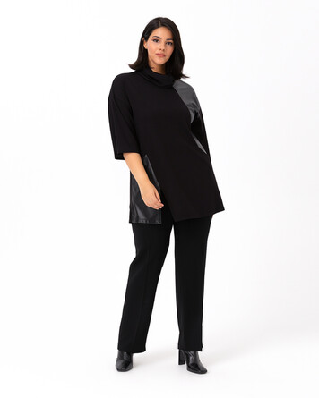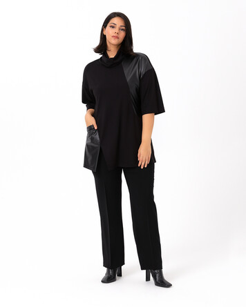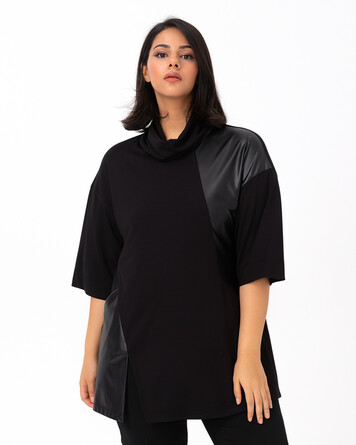Sweatshirt kumaşı ve deri dörünümü detayı ile çift parçalı şıklığa eni bir yorum getiren kısa kollu sweatshirt, yarım balıkçı yaka detayı ile feminen görünüme ışık tutuyor. Sweatshirt'ü joggger pantolonlar ile kombinleyebilir, şıklığınızı spor bir çanta ile tamamlayabilirsiniz.