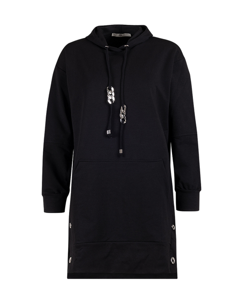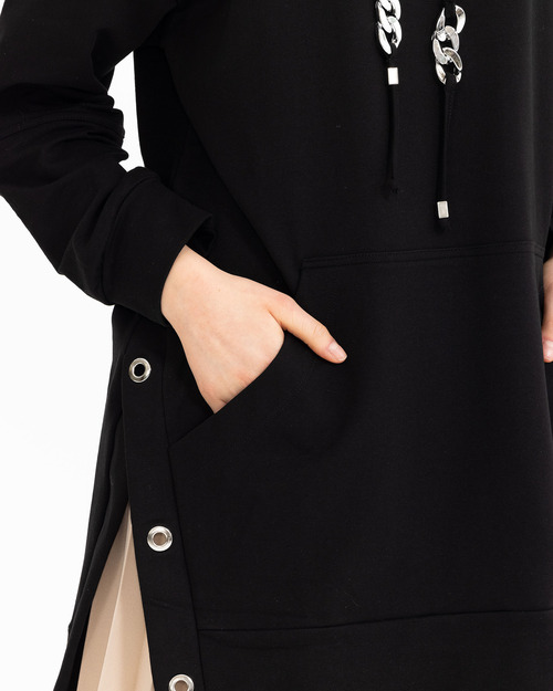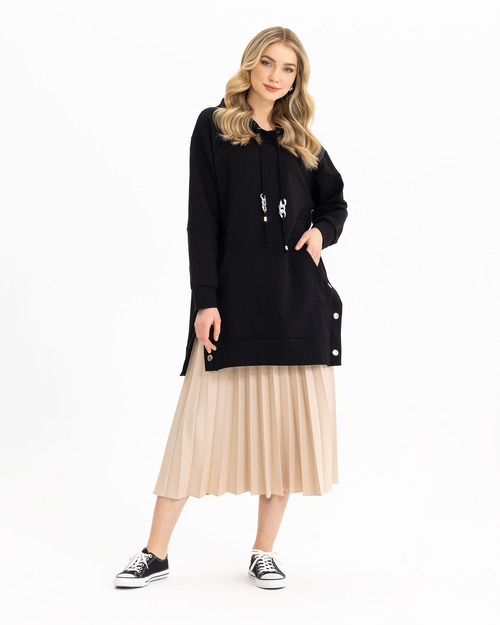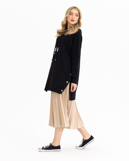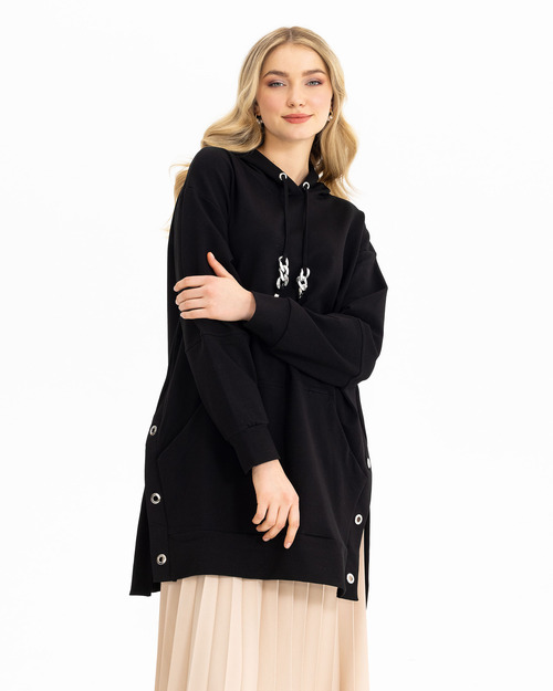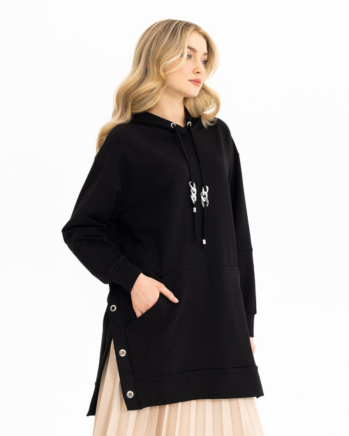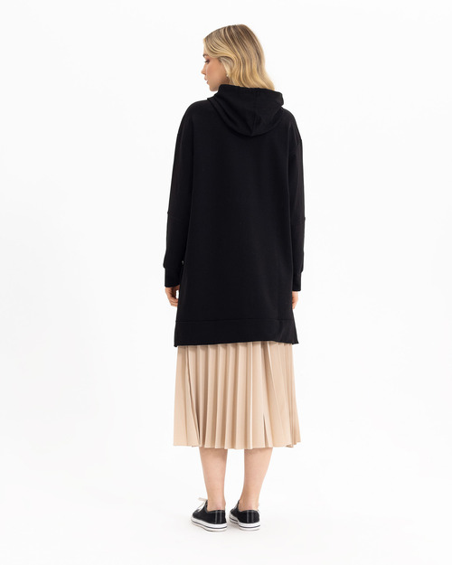 Rahat kesimi ile konfor sunan sweatshirt, siyah ve yeşil renk seçenekleri ile beğeninize çıkıyor. Kuş gözü detayları ve kanguru cebi ile dikkat çeken sweatshirt'ü pliseli etekler üzerinde kombinlemeyi deneyebilirsiniz.