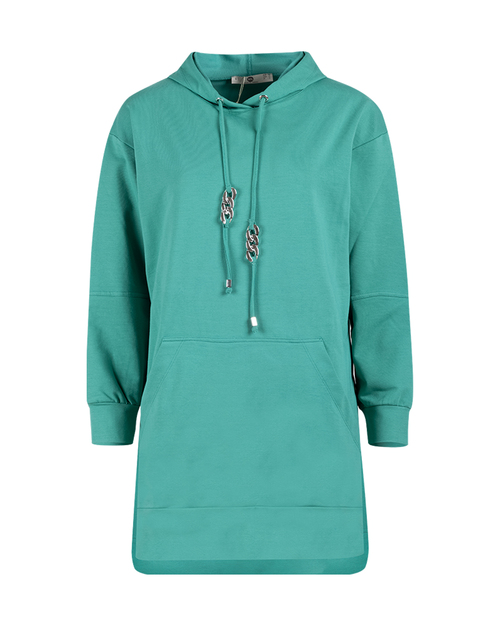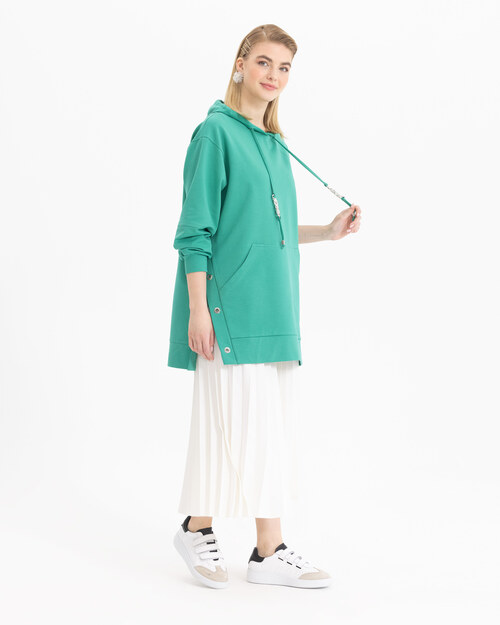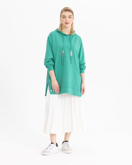 Rahat kesimi ile konfor sunan sweatshirt, siyah ve yeşil renk seçenekleri ile beğeninize çıkıyor. Kuş gözü detayları ve kanguru cebi ile dikkat çeken sweatshirt'ü pliseli etekler üzerinde kombinlemeyi deneyebilirsiniz.