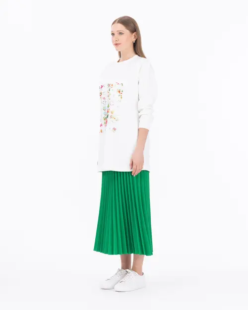 Örme kumaştan üretilen sweatshirt, yüksek kaliteli işçiliği ile öne çıkıyor. Nakış detayları, ürüne şık ve estetik bir görünüm katarken, rahat kesimi de günlük kullanıma uygunluk sunuyor. Geçiş mevsiminde rahatlıkla tercih edebileceğiniz sweatshirt ü, pliseli eteklerinizle bir araya getirebilirsiniz.