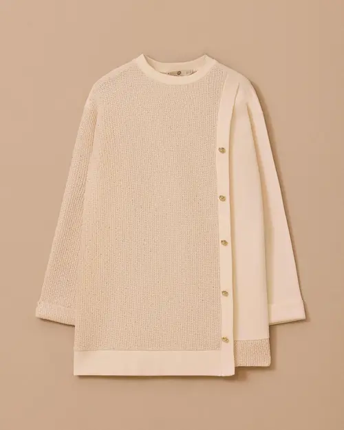 Pul Detaylı Çift Kumaşlı Sweatshirt, pul işlemeleri ve kontrast kumaşıyla modern, ışıltılı ve şık bir görünüm sunar.