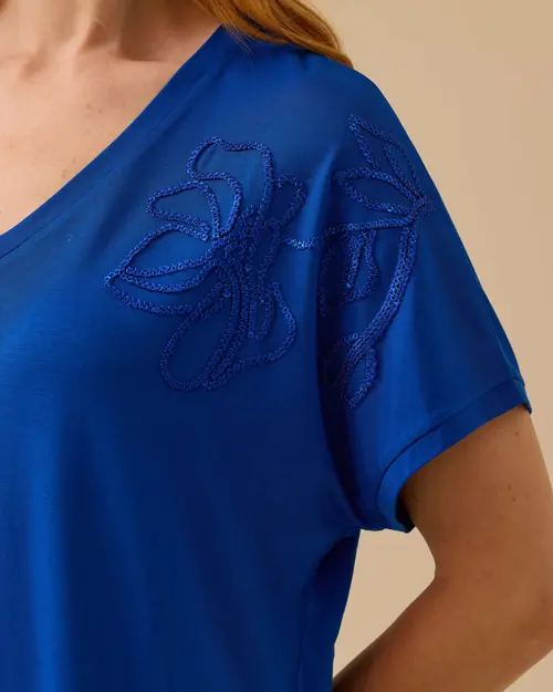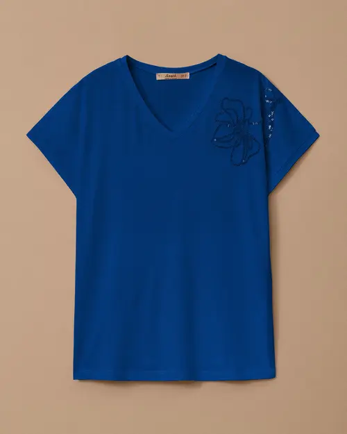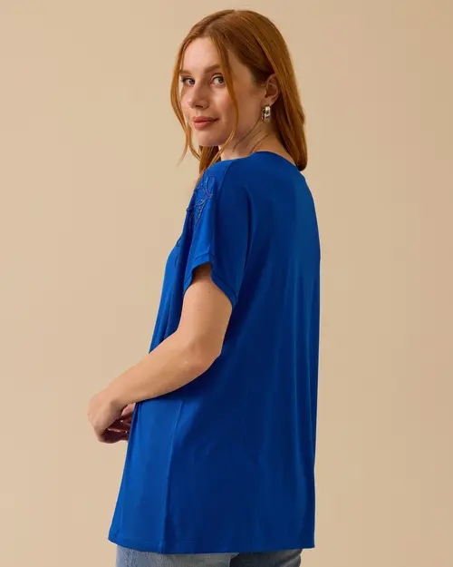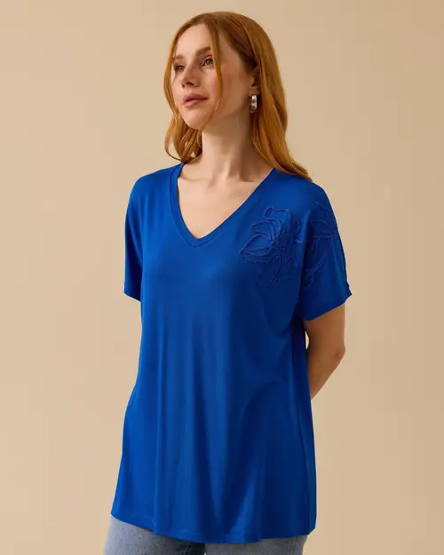 V Yaka Nakışlı Penye Tişört, zarif nakış detayları ve V yaka kesimiyle şıklığı bir araya getiriyor. Rahat penye kumaşıyla hem şık hem de konforlu bir seçenek.