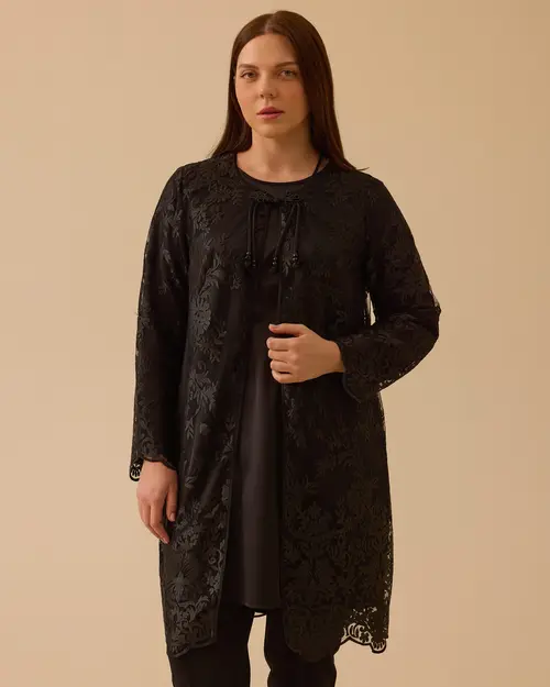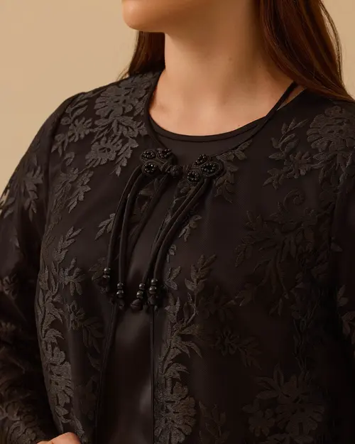 Büyük Beden İç Bluzlu Nakışlı Takım, zarif nakış detayları ve uyumlu tasarımıyla şık ve rahat bir kombin sunar.