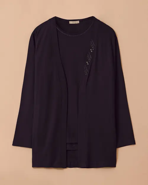 Büyük beden taş detaylı hırkalı takım, taş süslemeleriyle görünümü güçlendirir.