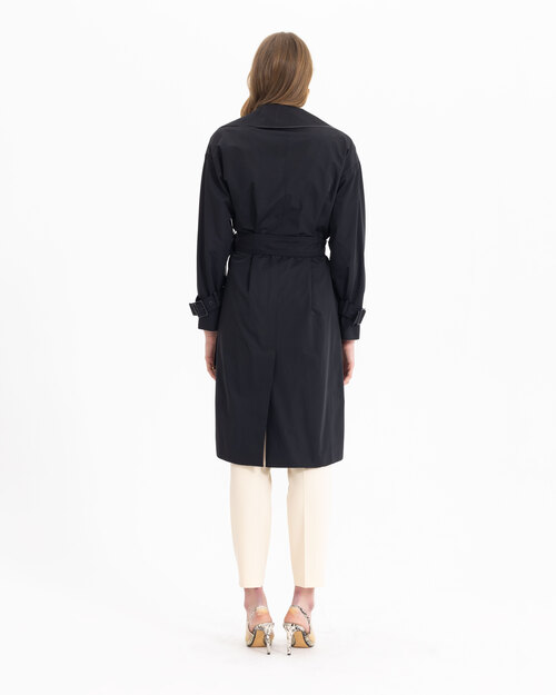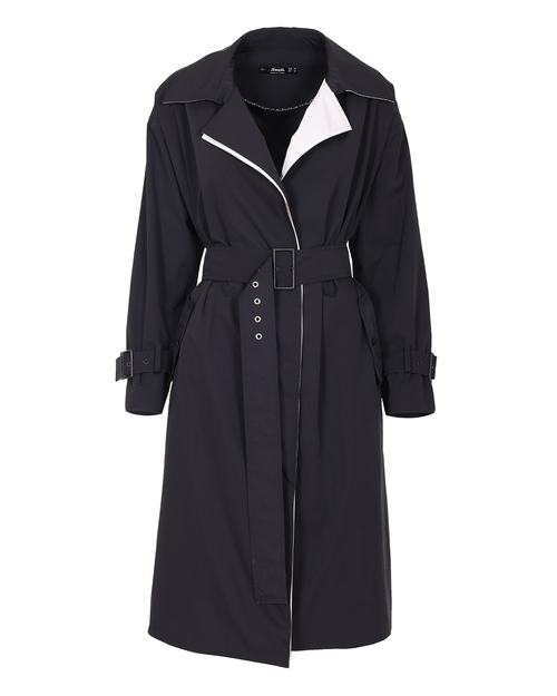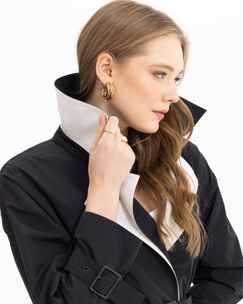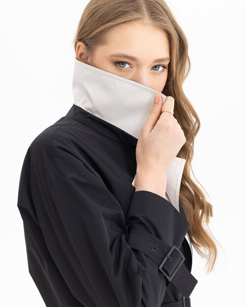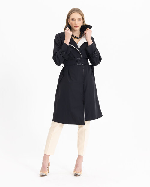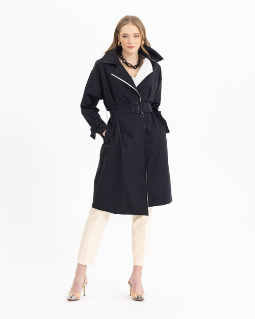 Kontrast renk geçişi ile dikkat çeken trençkot, belindeki kemeri ile feminenlik katıyor. Siyah sevenler için güçlü bir tercih olan trençkotu, ofis kombinlerinizin üzerine adapte edebilirsiniz.