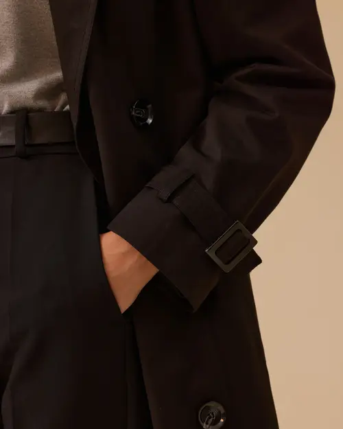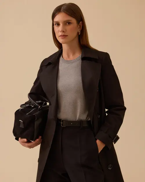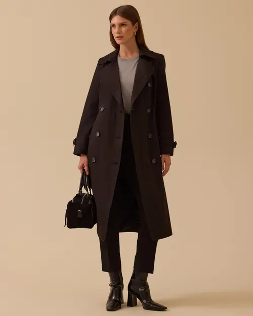 Kemerli Uzun Klasik Trençkot, çift sıra düğme detayıyla zamansız bir şıklık sunar.