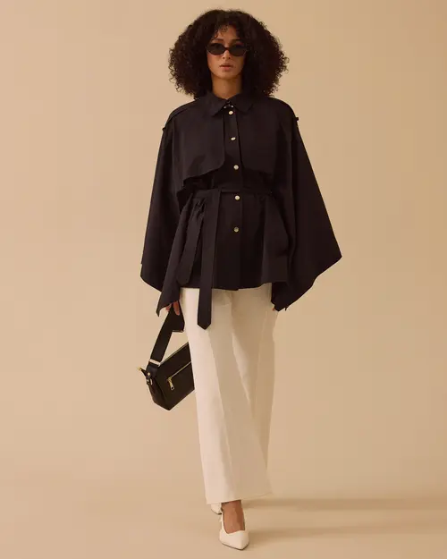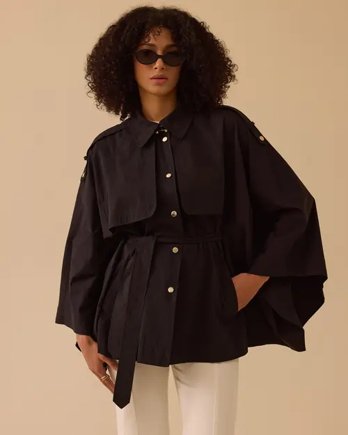Kuşaklı Cep Detaylı Pelerin Trençkot, pelerin kesimi, kuşak detayı ve fonksiyonel cepleriyle modern, şık ve güçlü bir stil sunar.
