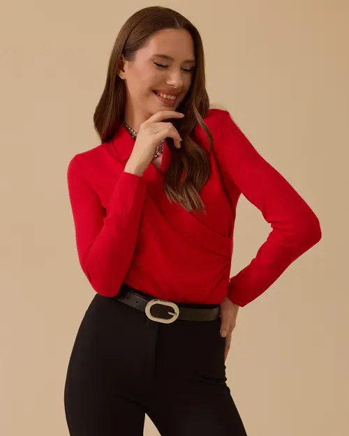 Kruvaze Drapeli Triko Bluz, zarif kruvaze yaka detayı ve drapeli formu ile modern ve şık bir siluet sunarken esnek yapısıyla gün boyu konfor sağlar.