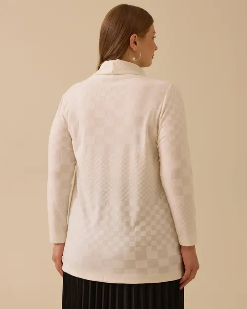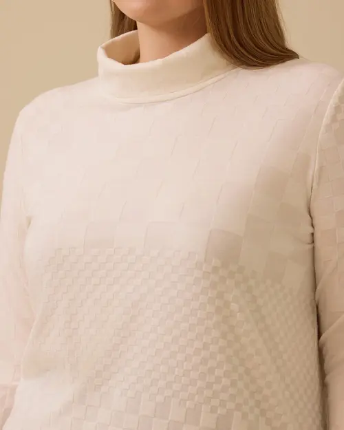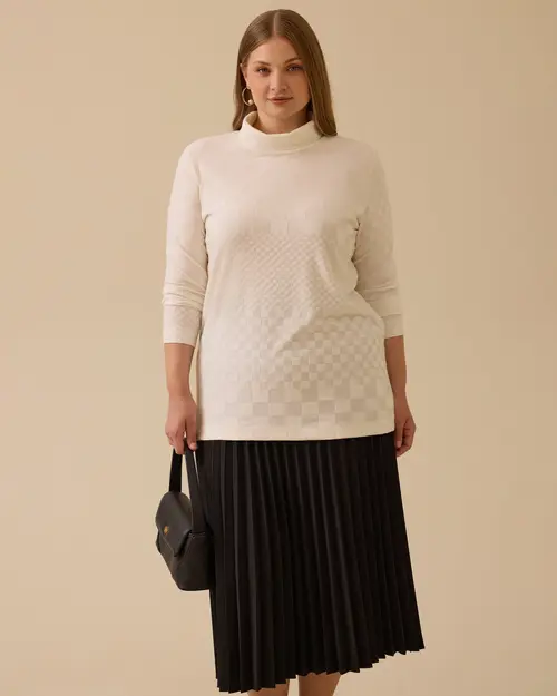 Büyük Beden Dik Yaka Desenli Triko Bluz, rahat kalıbıyla gün boyu konfor sunar.