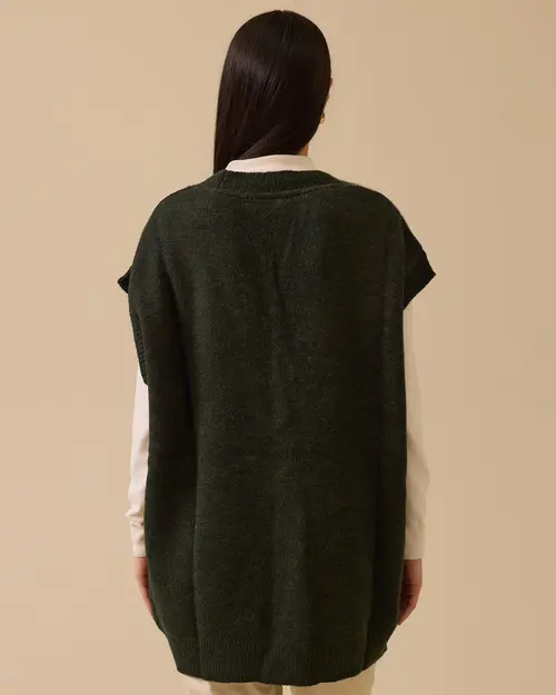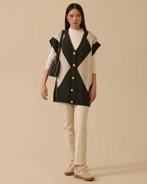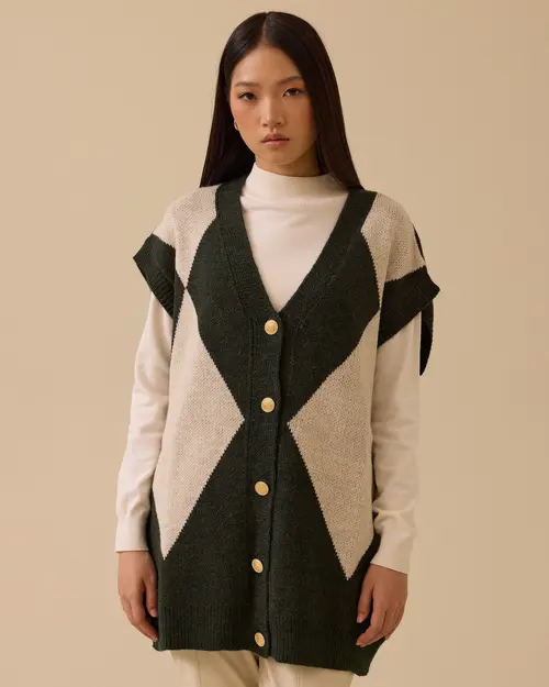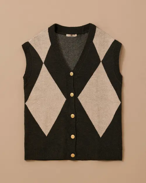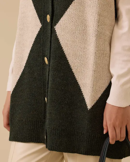 Blok Geçişli Düğmeli Triko Hırka, modern renk geçişleri ve düğme detayıyla sade şıklık sunar.