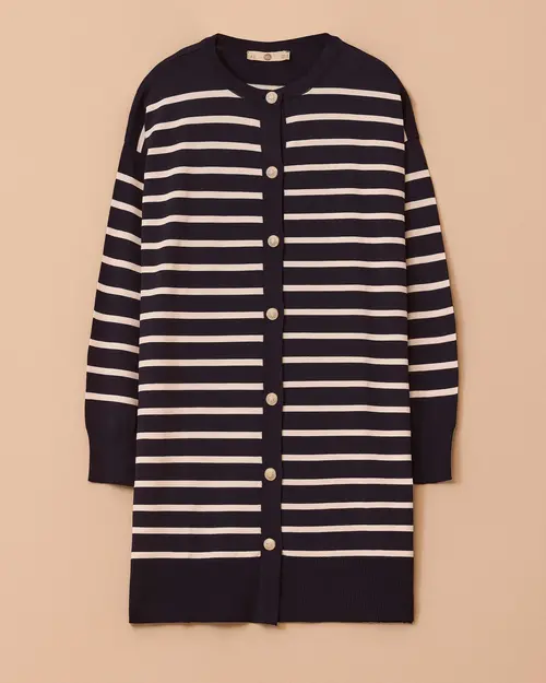 Çizgili diz üstü triko hırka, yumuşak dokusuyla konfor sunar,dinamik bir görünümü garantiler.