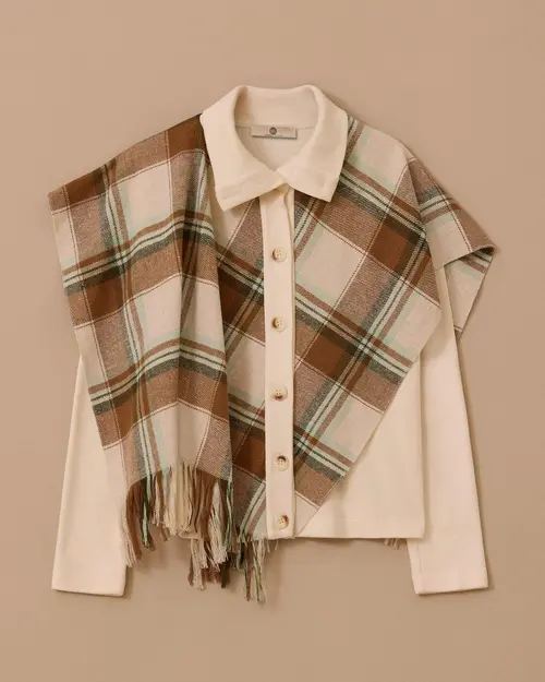 Şal Görünümlü Ekose Desenli Triko Hırka, modern ekose deseni ve püskül detaylarıyla şık bir duruş sunar.