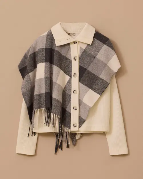 Şal Görünümlü Ekose Desenli Triko Hırka, modern ekose deseni ve püskül detaylarıyla şık bir duruş sunar.