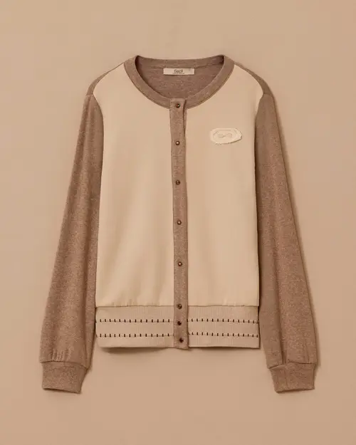 Boncuk Detaylı Çift Kumaşlı Triko Hırka, konforlu yapısı ve zarif boncuk işlemeleriyle öne çıkar.
