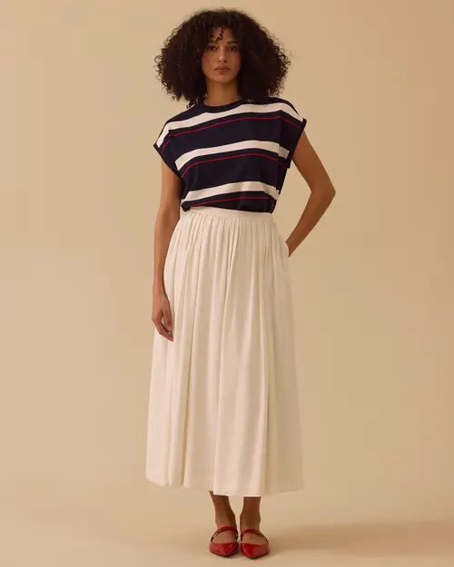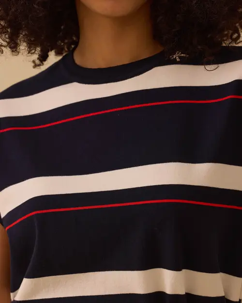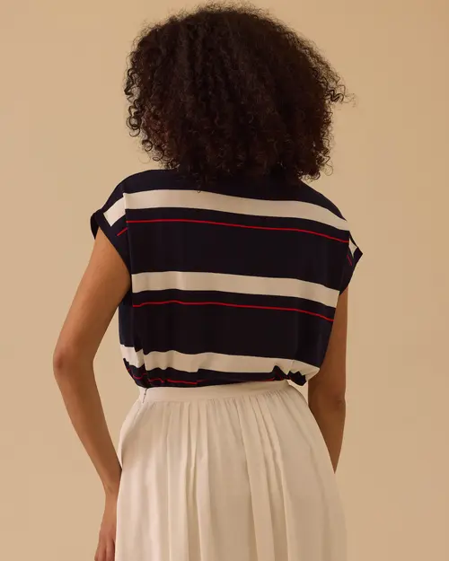 Çizgili Bel Boy Kısa Kollu Triko Bluz, modern çizgileri ve rahat kesimiyle şık ve konforlu kullanım sunar.