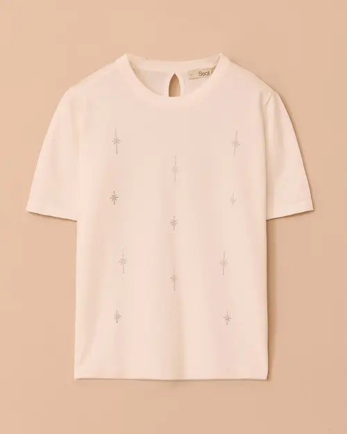 Taş detaylı kısa kollu triko bluz, zarif dokunuşlarla hareket kazanır, rahat kalıbı sayesinde günlük ve ofis kombinlerine kolayca uyum sağlar