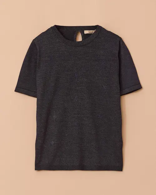 Taş detaylı kısa kollu triko bluz, zarif dokunuşlarla hareket kazanır, rahat kalıbı sayesinde günlük ve ofis kombinlerine kolayca uyum sağlar