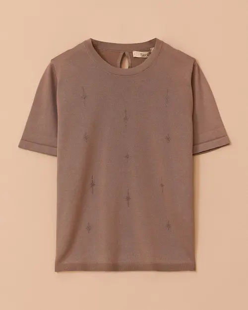 Taş detaylı kısa kollu triko bluz, zarif dokunuşlarla hareket kazanır, rahat kalıbı sayesinde günlük ve ofis kombinlerine kolayca uyum sağlar