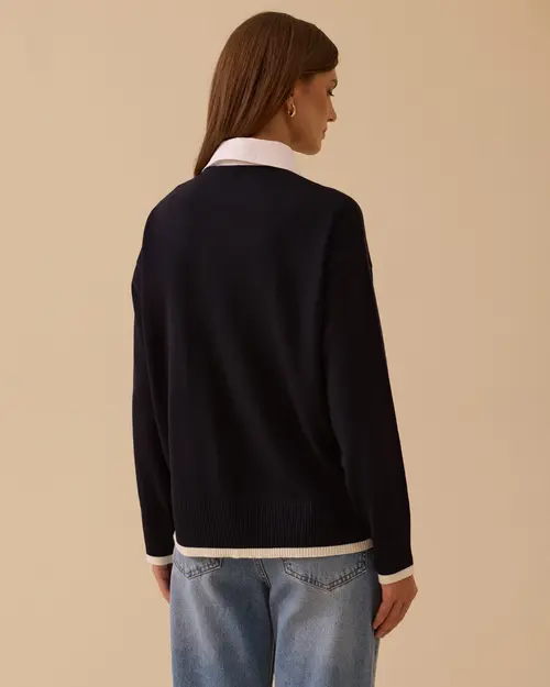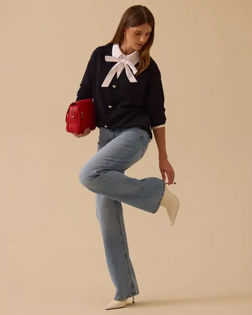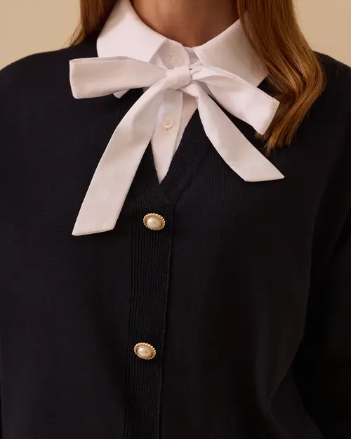 Yakası Bağlamalı İnci Düğmeli Triko, zarif tasarımı ve şerit detaylarıyla modern şıklık sunar.