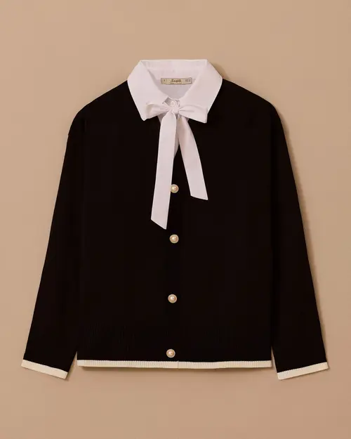 Yakası Bağlamalı İnci Düğmeli Triko, zarif tasarımı ve şerit detaylarıyla modern şıklık sunar.